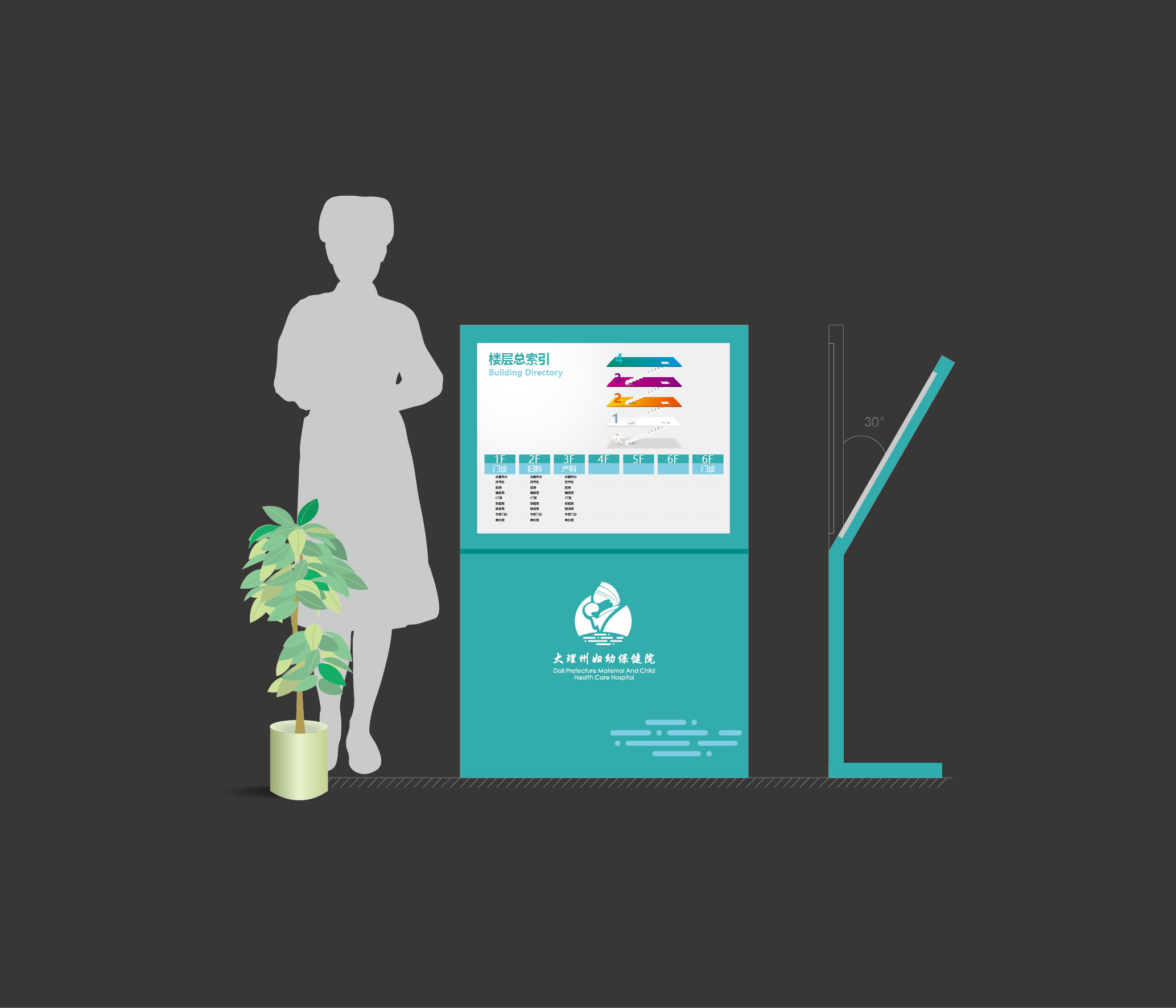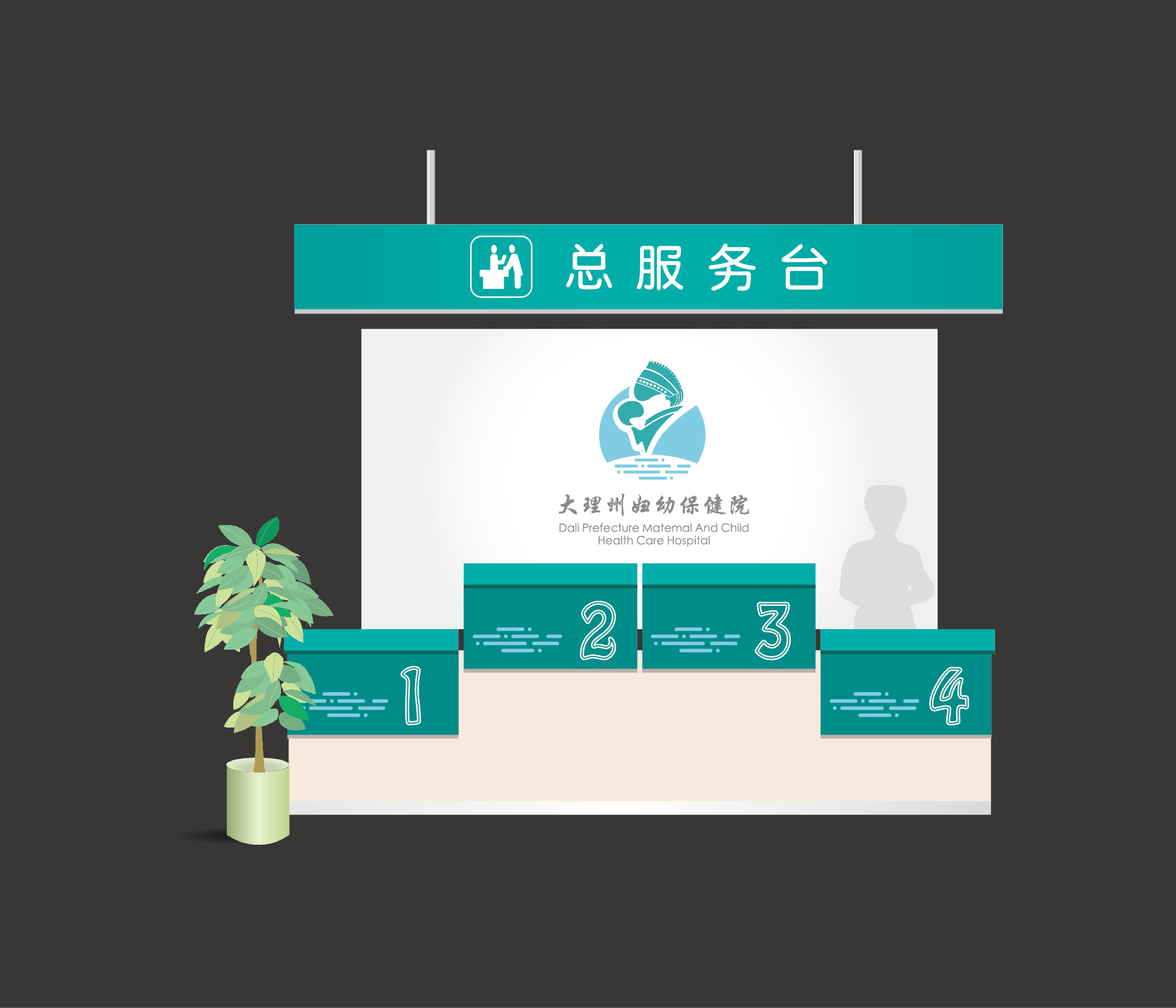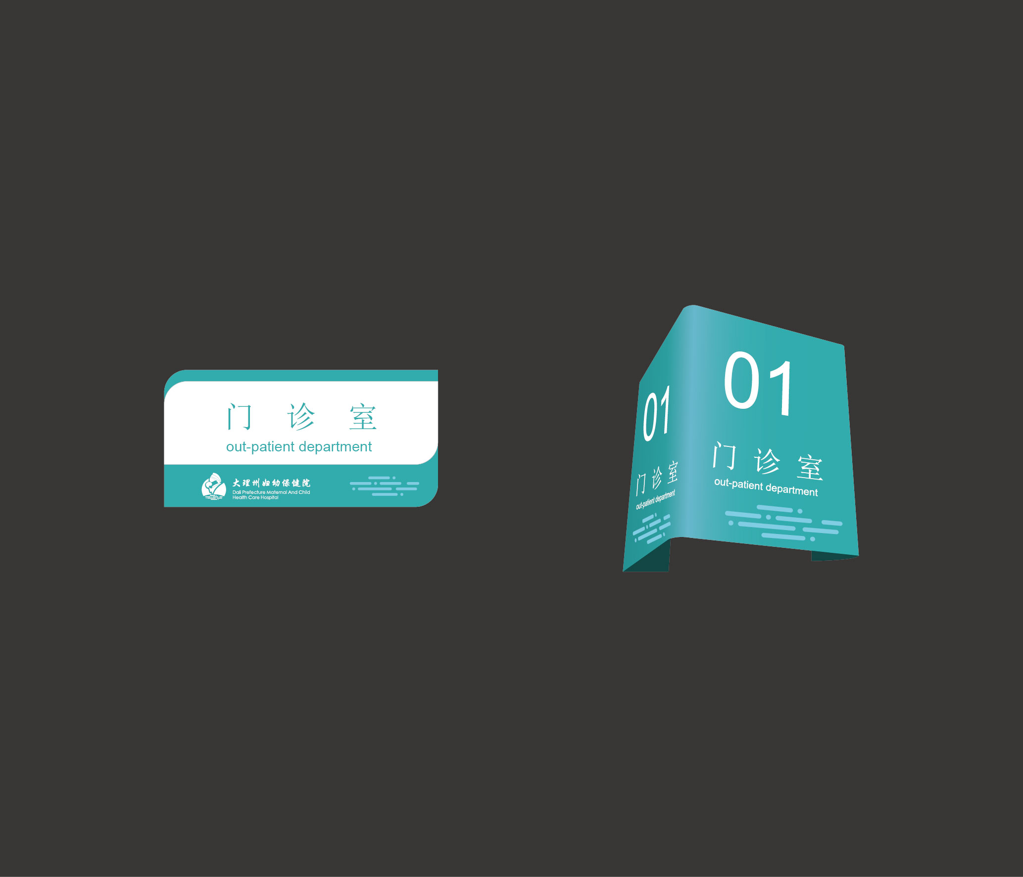 務(wù)臺(tái)、指示臺(tái)、病房床號(hào)、患者信息牌、醫(yī)護(hù)人員標(biāo)志牌等均出現(xiàn)LOGO和輔助圖形的搭配應(yīng)